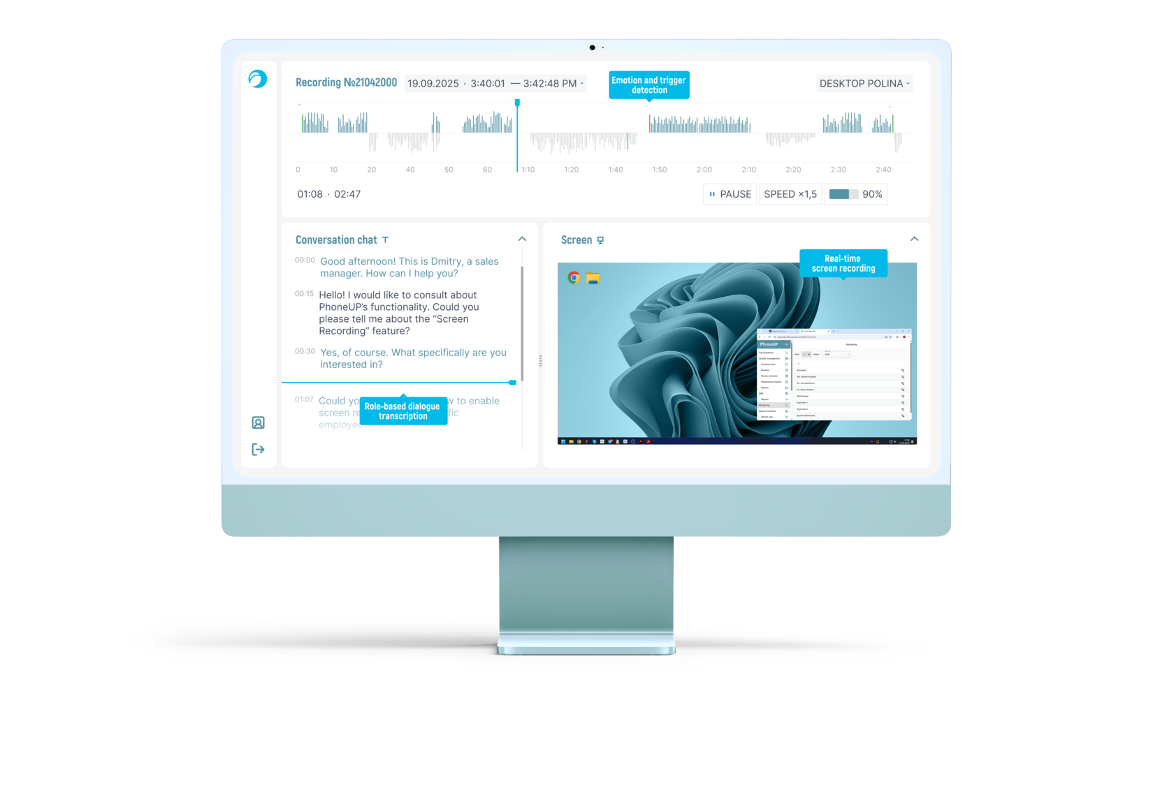 View employee screen recordings during calls, synchronized with conversation transcripts